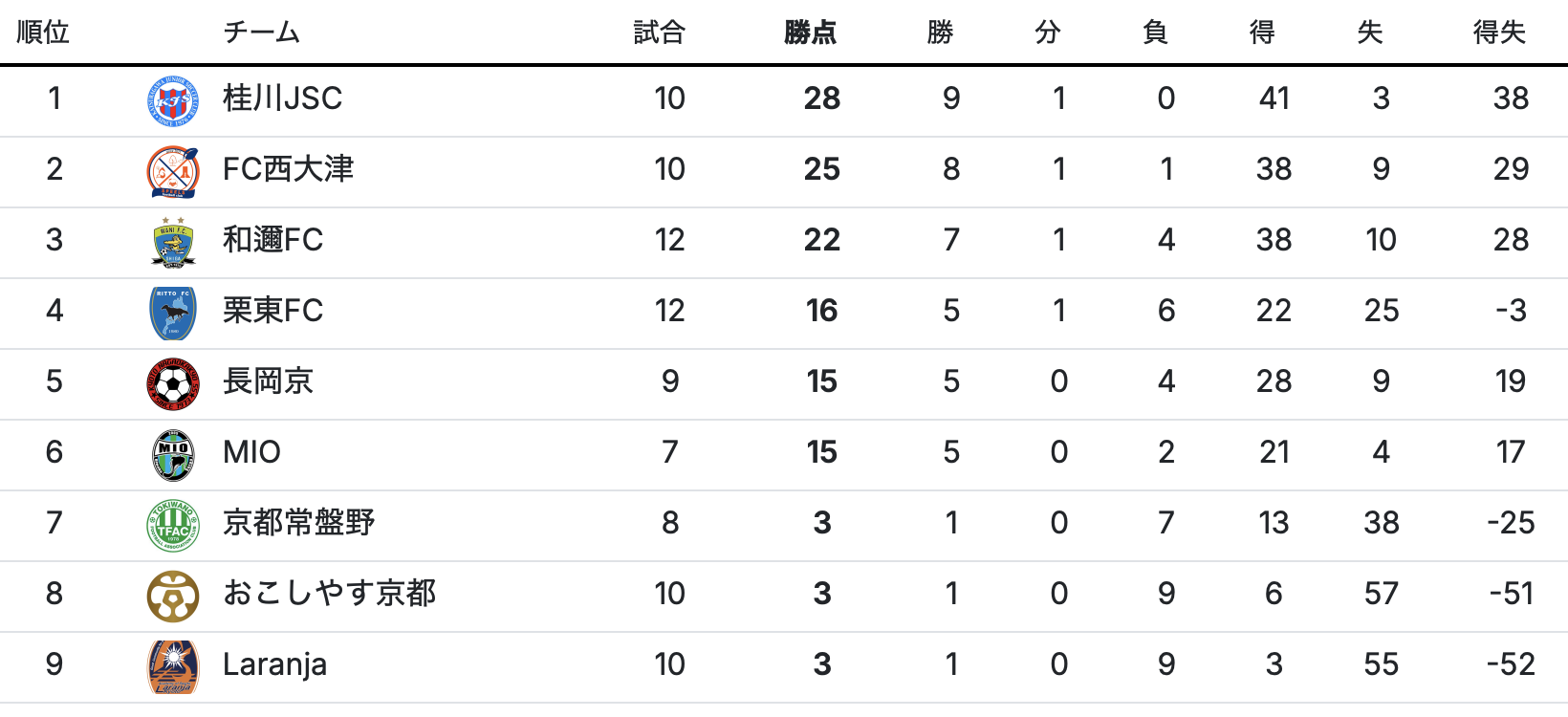 勝ち点が並んだ場合、次の順で順位を決めます