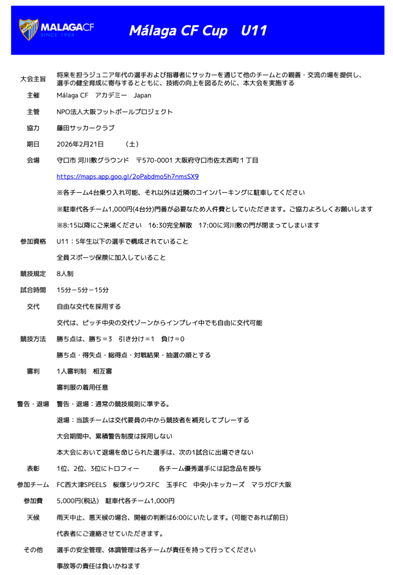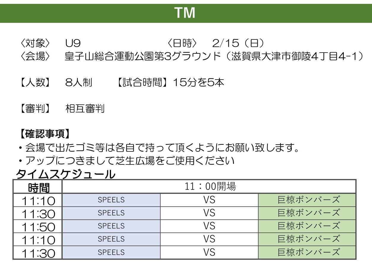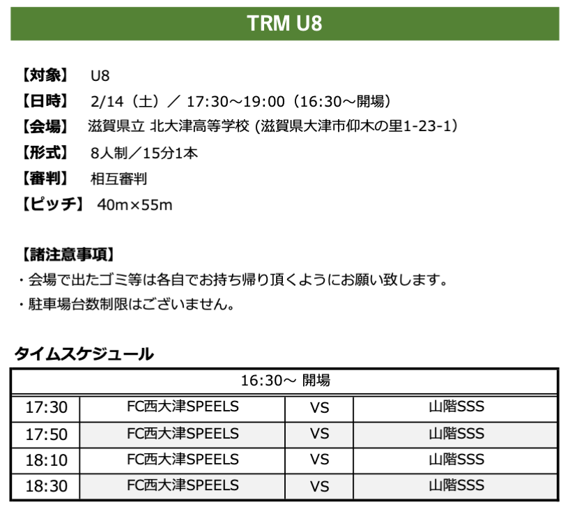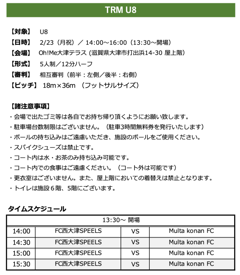 FC 西大津SPEELS 活動予定(要綱) ■2/23(月祝) ○U8 トレーニングマッチ ○U9/U10 トレーニングマッチ ■2/22(日) ○U9 トレーニングマッチ ■2/21(土) ○U11 Malaga CF Cup ○U12 Malaga CF Cup ■2/15(日) ○U9 トレーニングマッチ ■2/14(土) ○U8 トレーニングマッチ ○U10 第5回 Multa Konanカップ ○U12 第20回 ヴォンゴーレカップ
