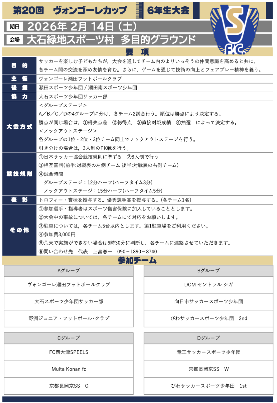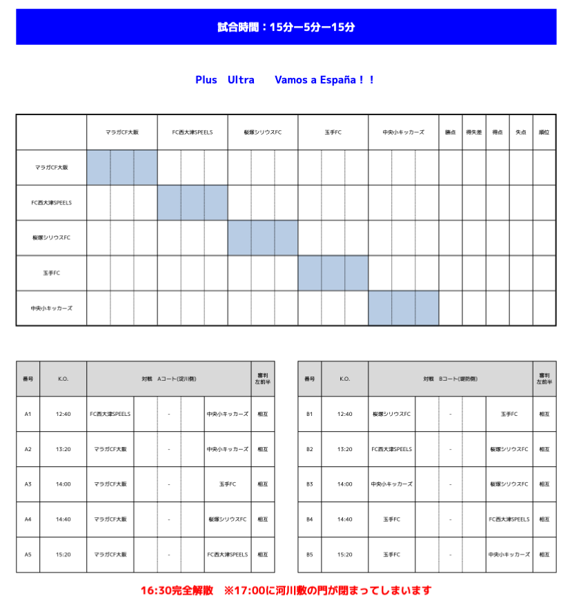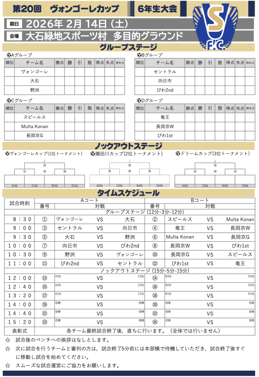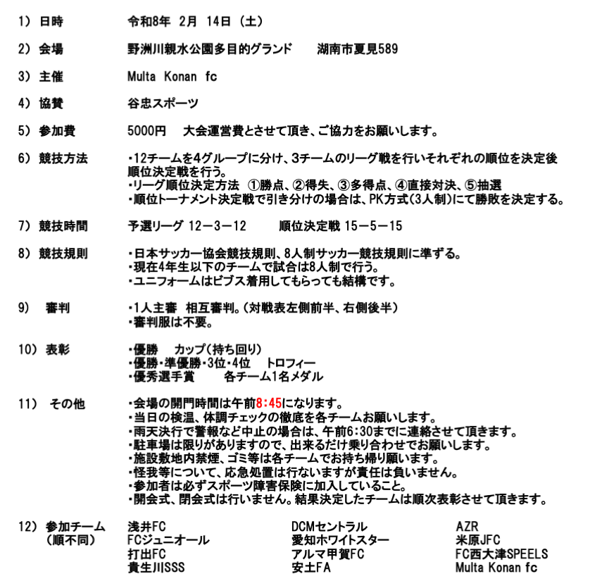 FC 西大津SPEELS 活動予定(要綱) ■2/23(月祝) ○U8 トレーニングマッチ ○U9/U10 トレーニングマッチ ■2/22(日) ○U9 トレーニングマッチ ■2/21(土) ○U11 Malaga CF Cup ○U12 Malaga CF Cup ■2/15(日) ○U9 トレーニングマッチ ■2/14(土) ○U8 トレーニングマッチ ○U10 第5回 Multa Konanカップ ○U12 第20回 ヴォンゴーレカップ