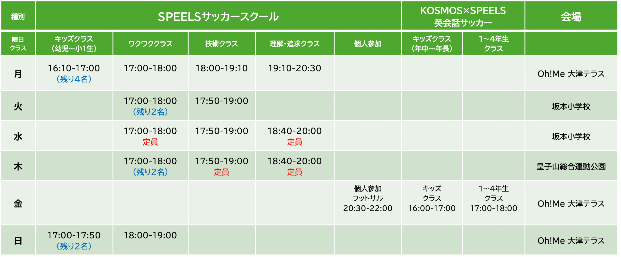 SPEELS SOCCER SCHOOLでは、質と満足度向上の為に平日クラス限定で